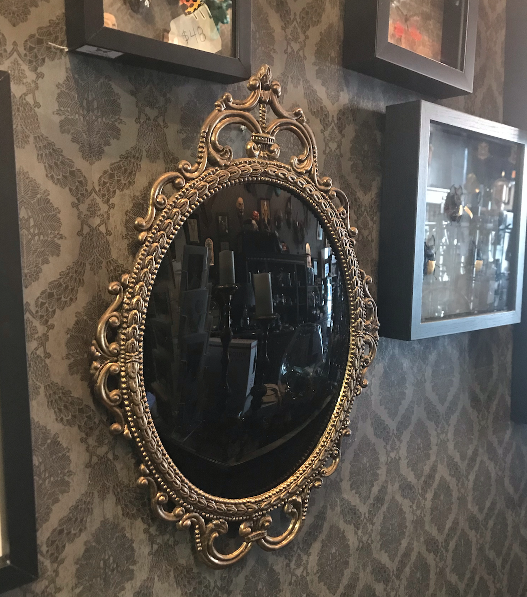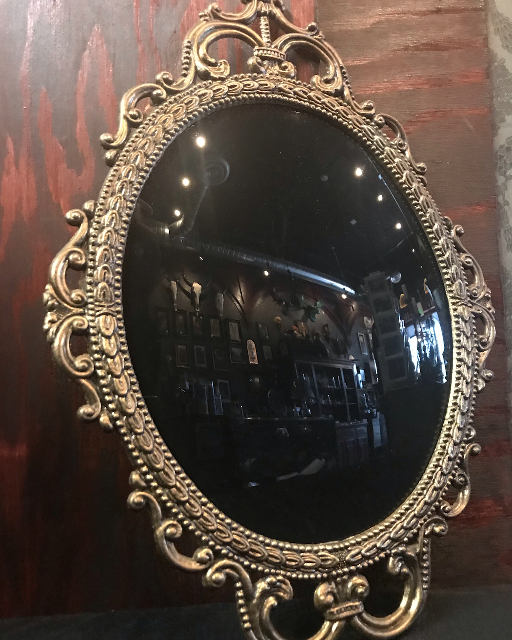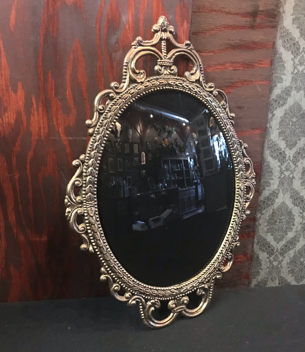 Glass Scrying Mirror with ornate brass frame and felt back. Mirror is about 17" tall by 12" wide. Ready to hang. Please note: due to the vintage parts used to make this piece, there may be minor imperfections consistent with age on the glass and or frame.